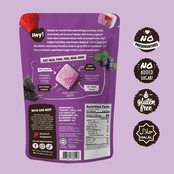 Get ready for a flavour explosion! Our Mixed Berry Fruit Bites are like a sweet and tangy fiesta with strawberries, blueberries and mulberries delivering a delightful crunch that melts in your mouth! Just like how astronaut’s food is made, Hey! Chips Fruit Bites are crafted with freeze-drying technology at -30ºC to lock in up to 97% of nutrients, freshness, and flavour, while giving an addictive crunch!