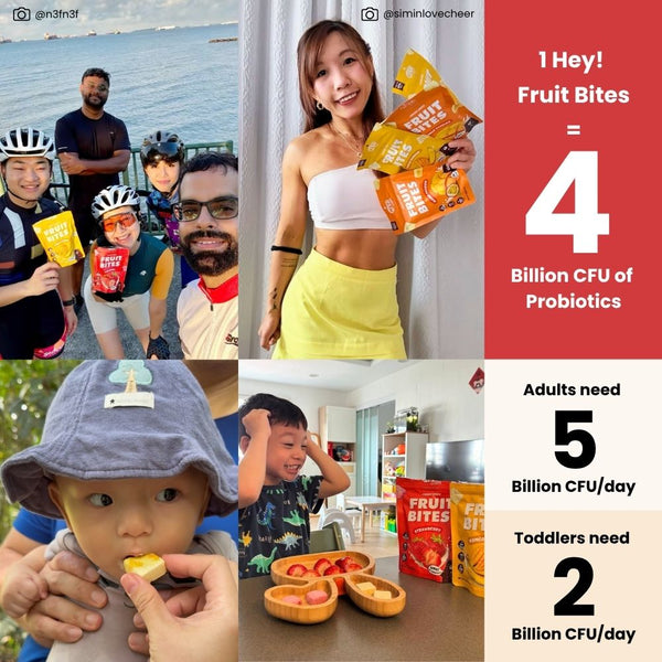 A pack of Hey! Fruit Bites contains 4 billion CFU of probiotics. These yoghurt melts are essential in providing gut-healthy probiotics for babies, toddlers and adults. Compared to typical yoghurt drops snacks in the baby market, Hey! Fruit Bites are incredibly clean and simple!Â